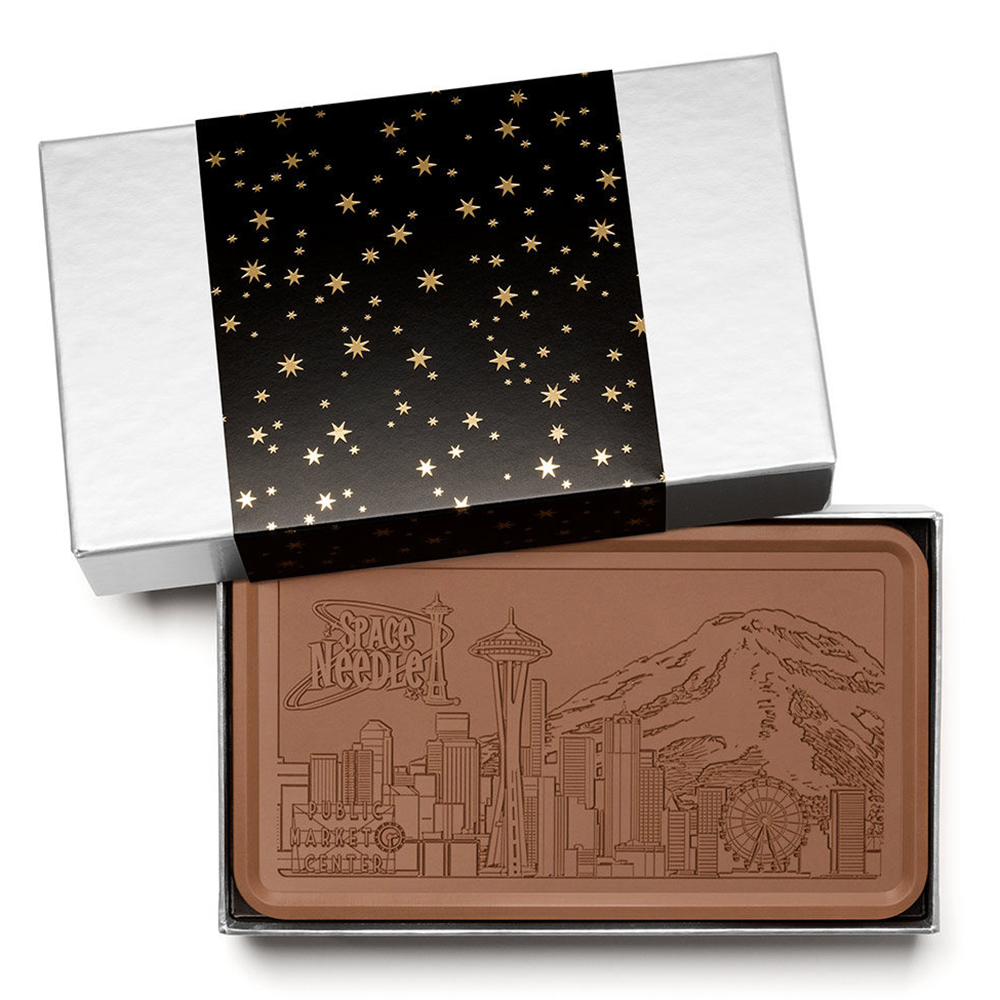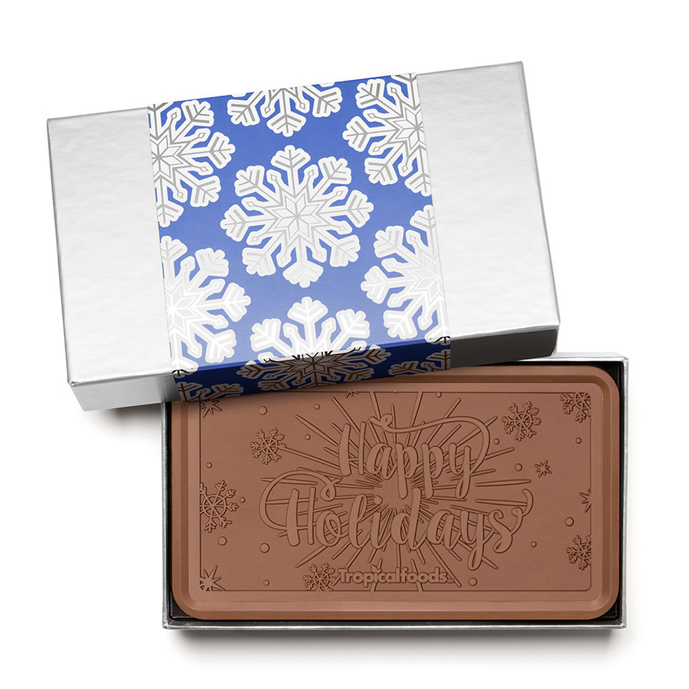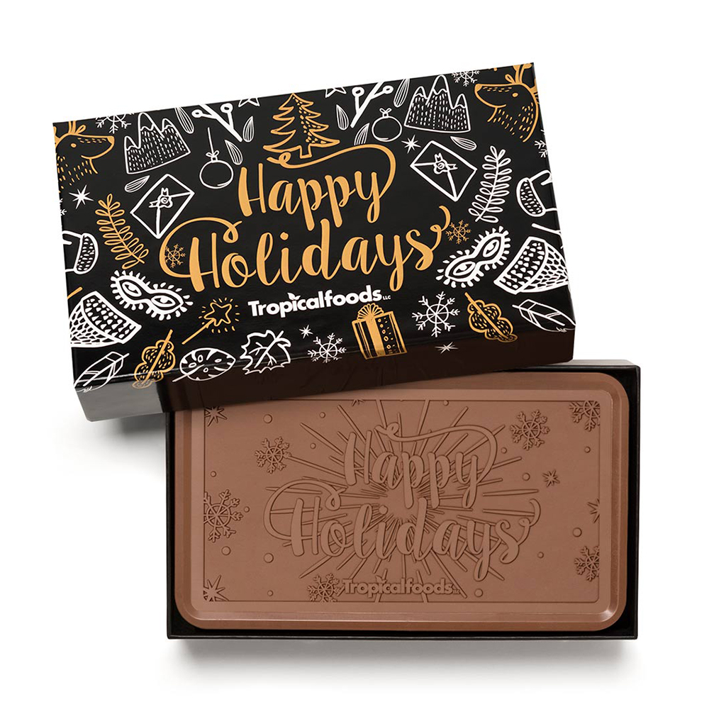Our most talked about and acclaimed gift for the holidays, this smaller version of our 2 lb. Executive Gift Bar. This remarkable custom bar is always remembered long after the last bite. Your choice of milk or dark Belgian chocolate