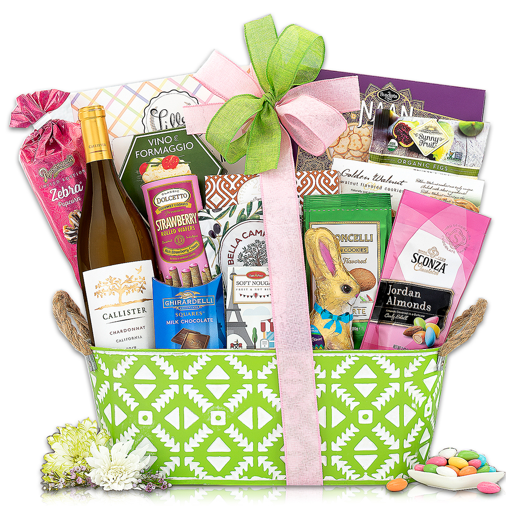 Callister Cellars chardonnay and a sweet and savory Easter assortment includes Popcornopolis Zebra chocolate popcorn, a milk chocolate bunny, candy coated almonds, raspberry and blackberry fruit jelly candy, organic dried figs, chocolate cookies thins, Ghirardelli milk chocolate, naan crisps, smoked Gouda cheese spread, walnut cookies, olives and more are brought together to create this Easter wine basket.